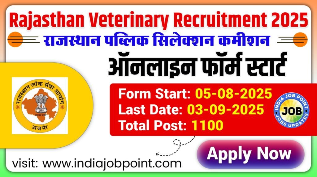 Rajasthan Public Service Commission (RPSC) invites online applications for recruitment to the post of Veterinary Officer for 1100 vacancies under Animal Husbandry Department. All eligible and interested male and female candidates can apply online at RPSC official website rpsc.rajasthan.gov.in from 05th August 2025 to till the application last date 03rd September 2025 for Veterinary Officer recruitment in Rajasthan.